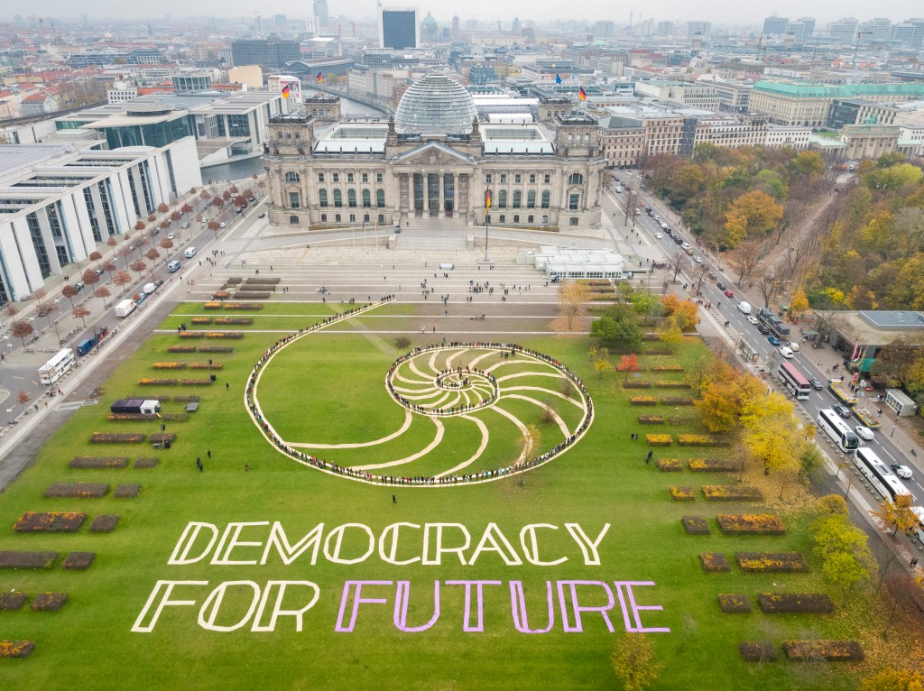 Yeah – die Idee war geboren. Zur Übergabe der Bürgerrats-Ergebnisse würde Mehr Demokratie gemeinsam mit John Quigley und seinem Team ein riesiges, wunderschönes Bild auf die Reichstagswiese bringen.