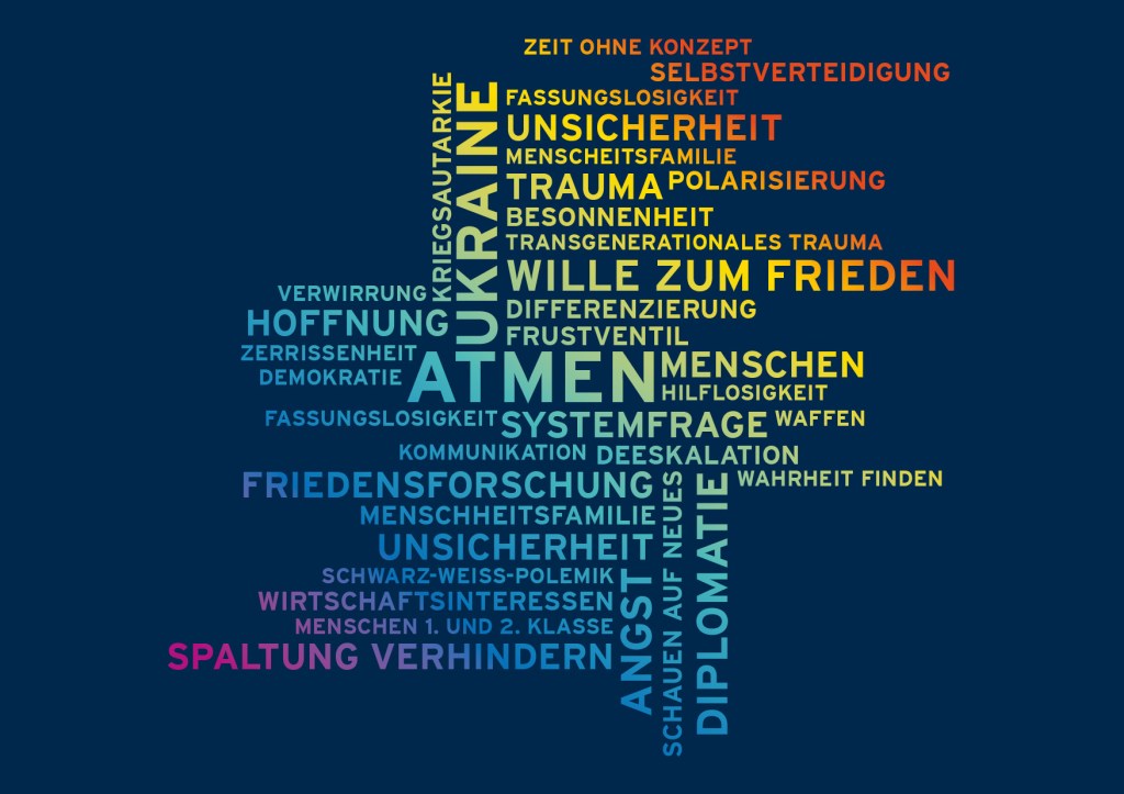 Diese Art von Friedensarbeit zu unterstützen ist eine Aufgabe für Mehr Demokratie – nicht nur in Bezug auf den Krieg in der Ukraine, sondern auch mit Blick auf Corona, die ständig im Hintergrund schwelende Klimakrise, Ungleichheit usw. Denn die Auswirkungen der sich überlagernden Krisen spüren wir hier und jetzt, in Familien, Freundeskreisen, Arbeitsumfeld und politischen Debatten. Je rauer der Ton und je unversöhnlicher die Positionen, desto schwieriger wird das Ringen um Lösungen. Ganz akut begleitet uns der Krieg in der Ukraine mit schrecklichen Bildern und Berichten, bald werden vielleicht wieder Hochwasser und Waldbrände hinzukommen. Auf der rationalen Ebene tauschen wir Argumente aus, ringen um Lösungen und geeignete Instrumente. Aber auch emotional müssen wir mit dem Geschehen umgehen. Was lösen die aktuellen Ereignisse und Erkenntnisse in uns aus? Wie kommen wir klar in einer Welt, die nie mehr so „in Ordnung“ sein wird, wie wir uns das wünschen?
