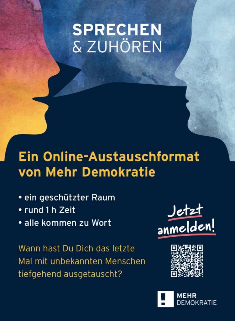 Auch im politischen Feld läuft die Kommunikation oft noch so ab, dass eine Person den anderen erklärt, was sie verstanden und herausgefunden hat. Im Gegensatz dazu bringen (so der oben zitierte ZEIT-Beitrag) gute Dialoge „Menschen so ins Gespräch miteinander, dass sie voneinander lernen. Selbst wer meint, etwas besser zu wissen, respektiert im Dialog sein Gegenüber als Menschen mit eigenen Emotionen, Interessen und Unsicherheiten. Auf diese Weise gelingt Verständigung besser als nach dem Informationsdefizit-Modell.“ Anders gesagt: Erst wenn wir uns gegenseitig mit allen Denkweisen und Gefühlen wahrnehmen und akzeptieren, erhalten wir eine stabile Basis, um Debatten zu führen, Argumente auszutauschen und nach Lösungen zu suchen. Das Format „Sprechen und Zuhören“ kann man demnach als eine Art Grundlagenforschung für eine besser funktionierende Demokratie verstehen.