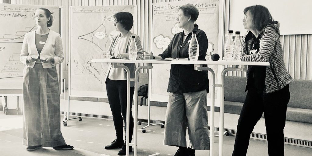 Das Einstiegspanel war aufgeteilt in einem Theorie- und einen Praxisteil. Während Raban Fuhrmann (Akademie für lernende Demokratie) und Jascha Rohr (Institut für Partizipatives Gestalten) zu Verfahrenstheorie, wissenschaftlicher Anbindung und Philosophie der Beteiligung gesprochen haben, hat unsere Frauenrunde (siehe oben) sich mit den praktischen Erfahrungen beschäftigt. Was ist nun wichtiger: Die geistige Anbindung und höhere Ausrichtung oder das manifestieren und Auf-den-Boden bringen?